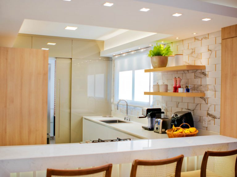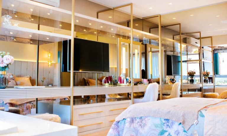 Apartamento moderno e sofisticado, com detalhes em dourado. Na decoração apostamos em tecidos mesclados entre leves como linhos e plumas, e também usamos couro para trazer um estilo mais marcante. As luzes amareladas tornam o ambiente mais aconchegante e cheio de delicadeza.