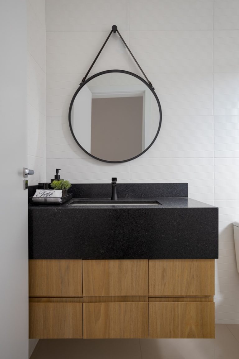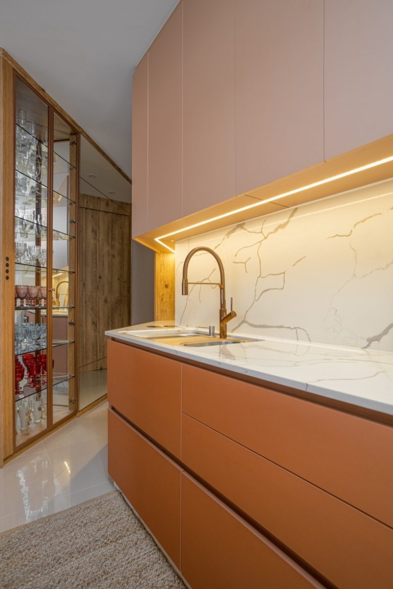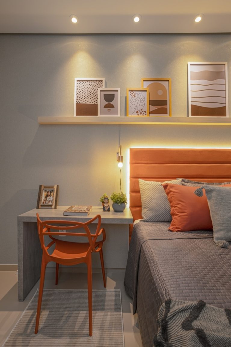 Apartamento moderno e sofisticado, com detalhes em dourado e cimento. As luzes amareladas tornam o ambiente mais aconchegante e cheio de delicadeza.